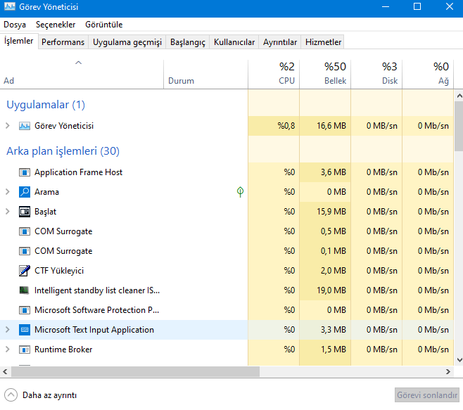 Laptop'da RAM boştayken %50'si kullanılıyor gözüküyor. 4 GB RAM bulunmakta.