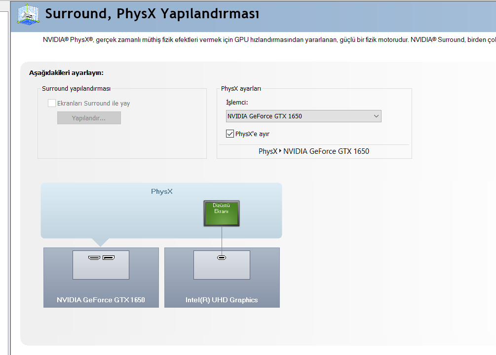 Merhaba, laptopumda 2 tane ekran kartı var bir tanesi Intel UHD Graphics diğeri ise GTX 1650 laptop çok güç harcamamak için daha verimsiz olan UHD ekran kartını kullanıyor. Oyuna geçtiğimde yani zorlandığında 1650'ye geçiyor. Test ettim UHD ekran kartı bozulmuş sadece 1650'yi kullanmak istiyorum. NVIDIA Denetim Masası'ndan işlemci olarak sadece 1650'yi seçtiğimde hala UHD'yi kullanıyor ne yapmam gerek? Şimdiden teşekkürler.
