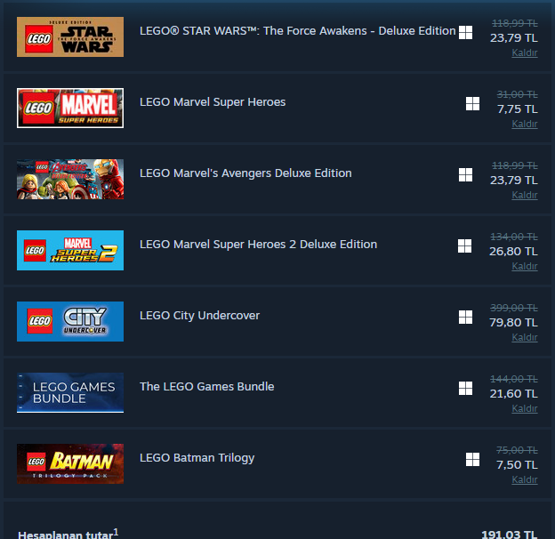 Şu an tüm lego oyunları indirimde benim gibi lego seviyorsanız iyi fırsat bende uzun süredir bekliyordum en iyi paketlerden biri bu ben gene de diğer oyunları da öneririmhttps://store.steampowered.com/sub/53403/