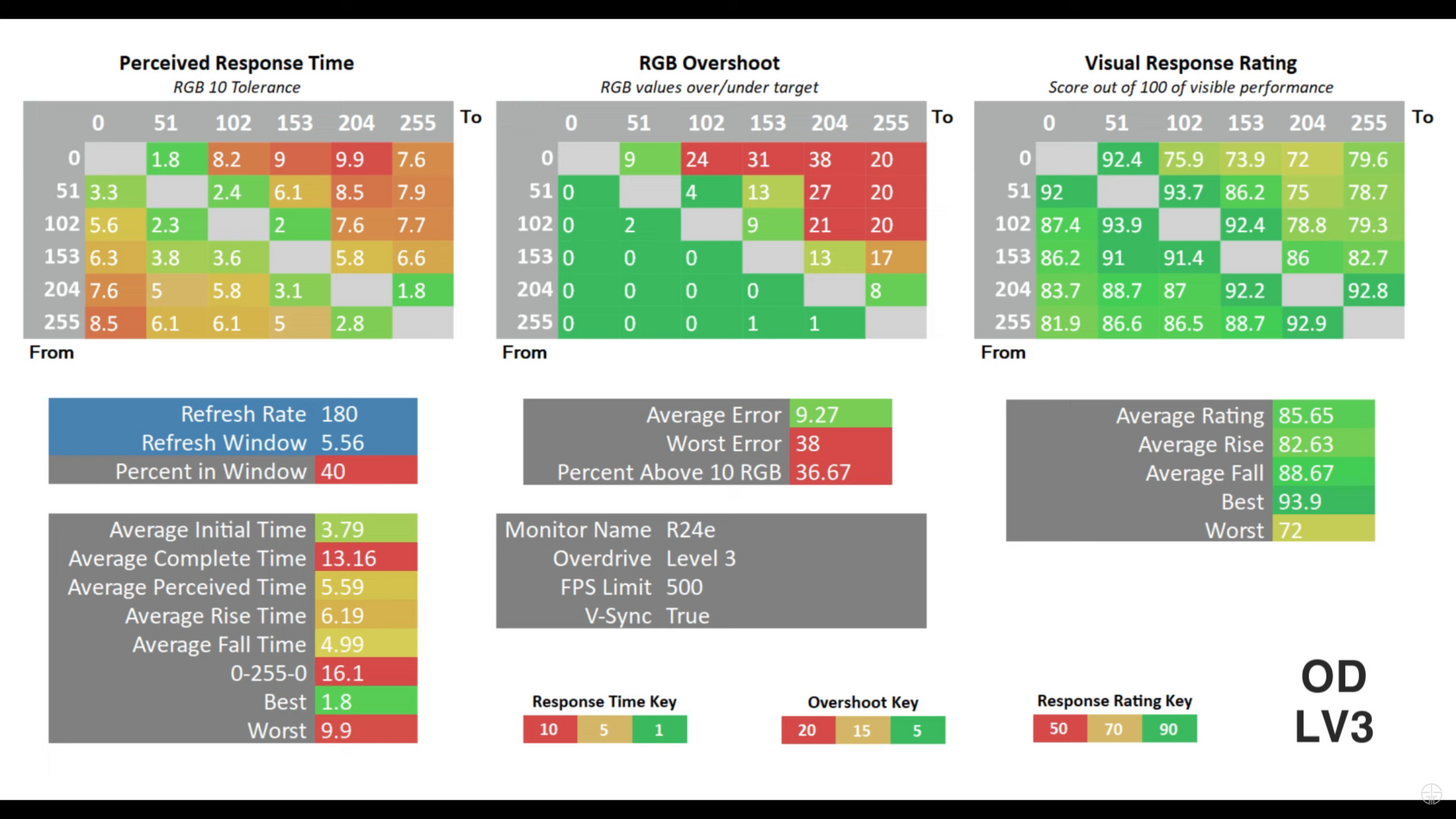 Öncelikle kağıt üzerinde 0.5ms MPRT gibi iddialı bir tepki süresi değeri görüyoruz. Bu değer, Motion picture response time olarak adlandırılan ve arka ışığın stroboskopik olarak kısılmasıyla elde edilen bir hareket bulanıklığı azaltma modunu ifade ediyor. R24E'de muhtemelen “extreme” veya benzeri bir OverDrive modunda bu 0.5ms iddiası var, fakat MPRT modları genelde parlaklığı ciddi ölçüde düşüyor ve FreeSync ile aynı anda kullanılmıyor. Nitekim pratikte asıl önemli olan griden griye geçiş hızı (GtG) ve aşırı hız ayarlarının dengesi. Monitörün OSD menüsünde 4 kademeli bir OverDrive (hız aşırtma) seçeneği bulunuyor: Level 0, 1, 2, 3 şeklinde (bazı kaynaklar bunları kapalı, normal, hızlandırılmış, vs. diye de belirtebilir). Yapılan testlerde level 2 ve level 3, en hızlı tepki sürelerini veren ayarlar olarak tespit edilmiş ancak level 3'te belirgin overshoot (aşırı tepki nedeniyle ters gölgelenme) oluştuğu gözlemlenmiş. Yani en ideal denge level 2 seviyesinde yakalanıyor diyebiliriz. Ben de kendi kullanımımda fabrikada gelen ayarın (varsayılan olarak level 2 idi) en iyi sonuç verdiğini fark ettim; level 3'e aldığımda özellikle siyah objelerin arkasında beyaz bir zemin olduğunda parlak bir iz bıraktığını gördüm, ki bu Overshoot'un göstergesidir.