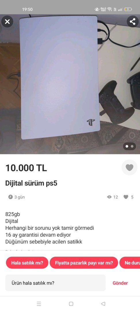 Merhaba çok uzatmayacağım. Letgo'dan 9.500₺ ye PS5 dijital versiyon ile 2.kumanda satan bir arkadaş vardı ve satma sebebi düğün olduğunu söyledi biz tamam dedik. sahibinden.com Param Güvende ile alacaktık o ilanı koydu biz ödeme emri başlattık. Sonra o dedi ki hafta sonu vs bazı kişiler problem yaşamış pazartesi halledelim. Ona da tamam dedik ve video istedik. Tam videoyu izlerken bir şey fark ettim ki çektiği konsol cdli idi bunu kendisine ilettiğimde mesajı okudu ve o güzel profil fotoğrafı bende yok oldu. Başka telefondan numarasını ekledim ve profili duruyordu bende anladım ki bu arkadaş dolandırıcı.