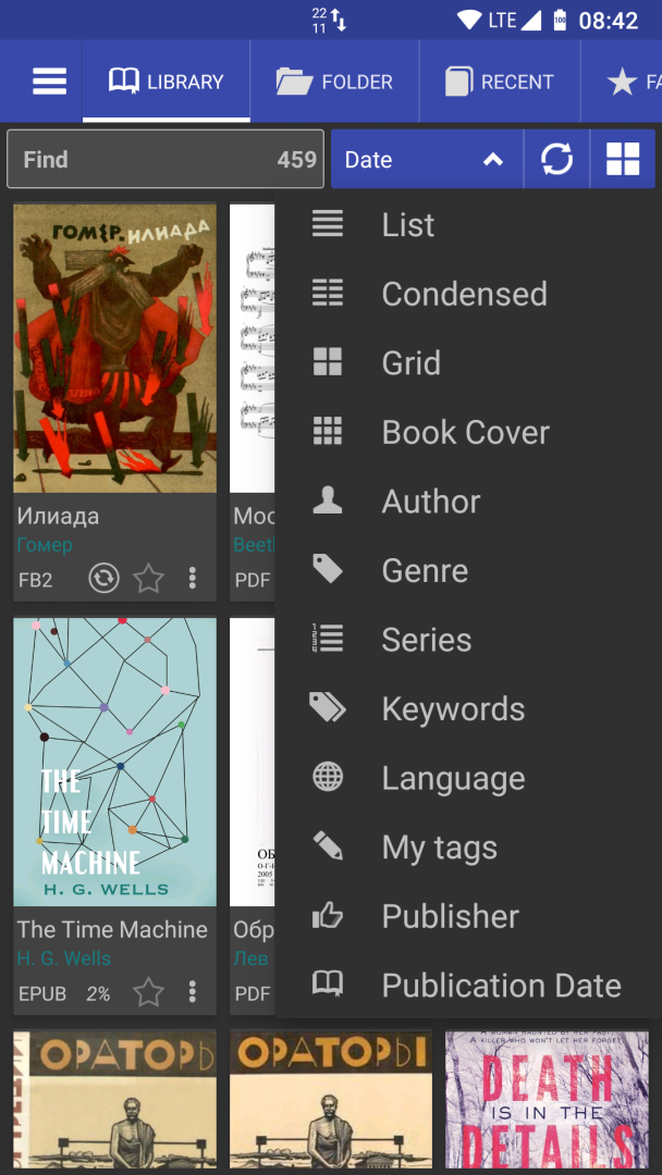 Librera Reader, PDF, EPUB, MOBI, DjVu, FB2, TXT, RTF, AZW, AZW3, HTML, CBZ, CBR, DOC, DOCX, formatlarındaki e-kitapları okumak için son derece özelleştirilebilir ve zengin özelliklere sahip bir uygulamadır.
