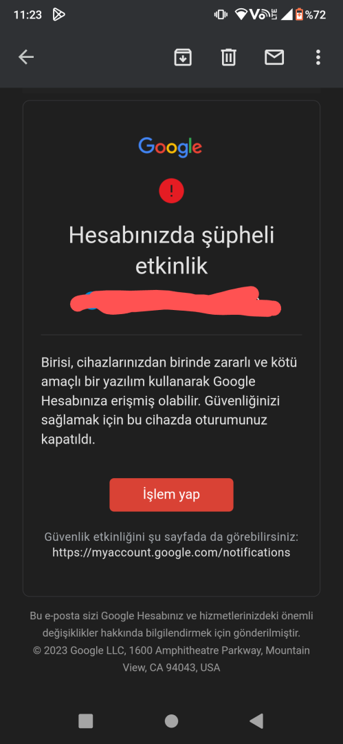 Bu sabah telefonumda Google hesabımdan çıkış yapılmış. Çok gariptir ki 2FA açık olmasına rağmen sadece aşağıdaki mail gelmiş saat 10.26'da. Ve gene şifremi değiştirmemişler. Eski şifremle giriş yaptım. Tabii ki şifremi değiştirdim gene.