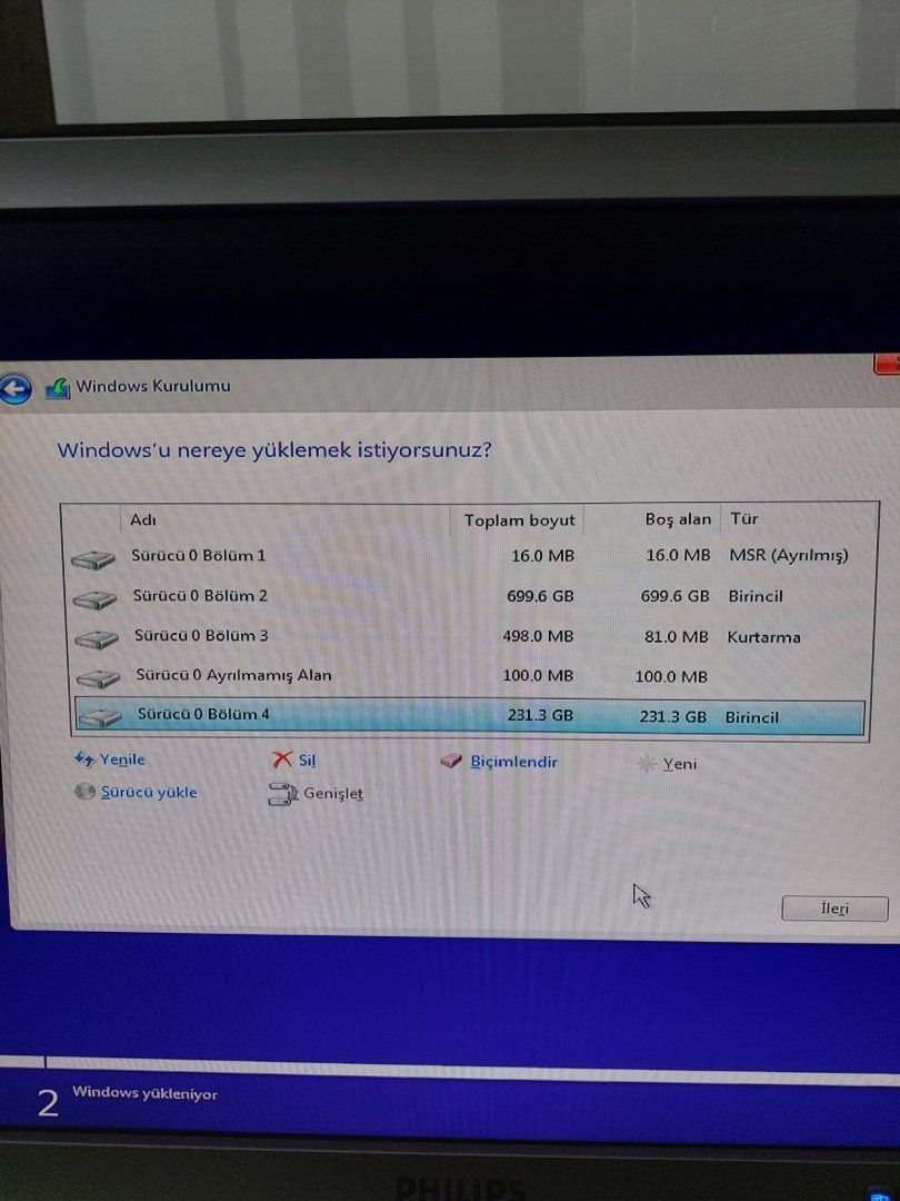 Eski HDD'yi PC'ye takıp Windows 10 kuracağım ancak resimdeki bölüm 2 ve bölüm 4 birleşmiyor. Hatırladığım kadarıyla bölüm 4'e önceden Mint Xfce kurmuştum ancak unutup biçimlendirdim bile. Bölüm 2'de Windows 10 vardı, Dual boot yapmıştım. Şu an tüm diskleri bicimlendirsem de silsem de fayda etmiyor, ayrı ayrı diskler olarak duruyorlar. Hatta bölüm 4'e kurmaya çalıştığımda şu hata geliyor: