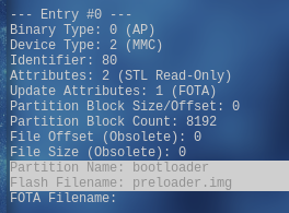 Uzun bir çıktı alacaksınız. Benim cihazımda 43 entryli bir liste geldi. "Flash Filename" kısmı dolu olan bölümlere belirtilen dosyaları yazdırmanız gerekiyor.