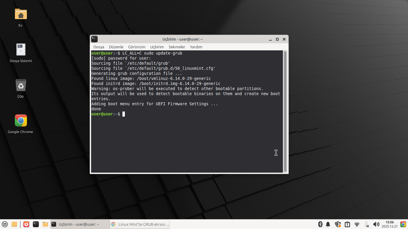 Komutu uçbirime yazıp, enter (giriş) tuşu ile çalıştıracaksın. Sonra çalışan işlemin bitmesini bekleyip, sistemi yeniden başlatacaksın ve sonucu paylaşacaksın. Şu an için yapman gereken bu kadar.