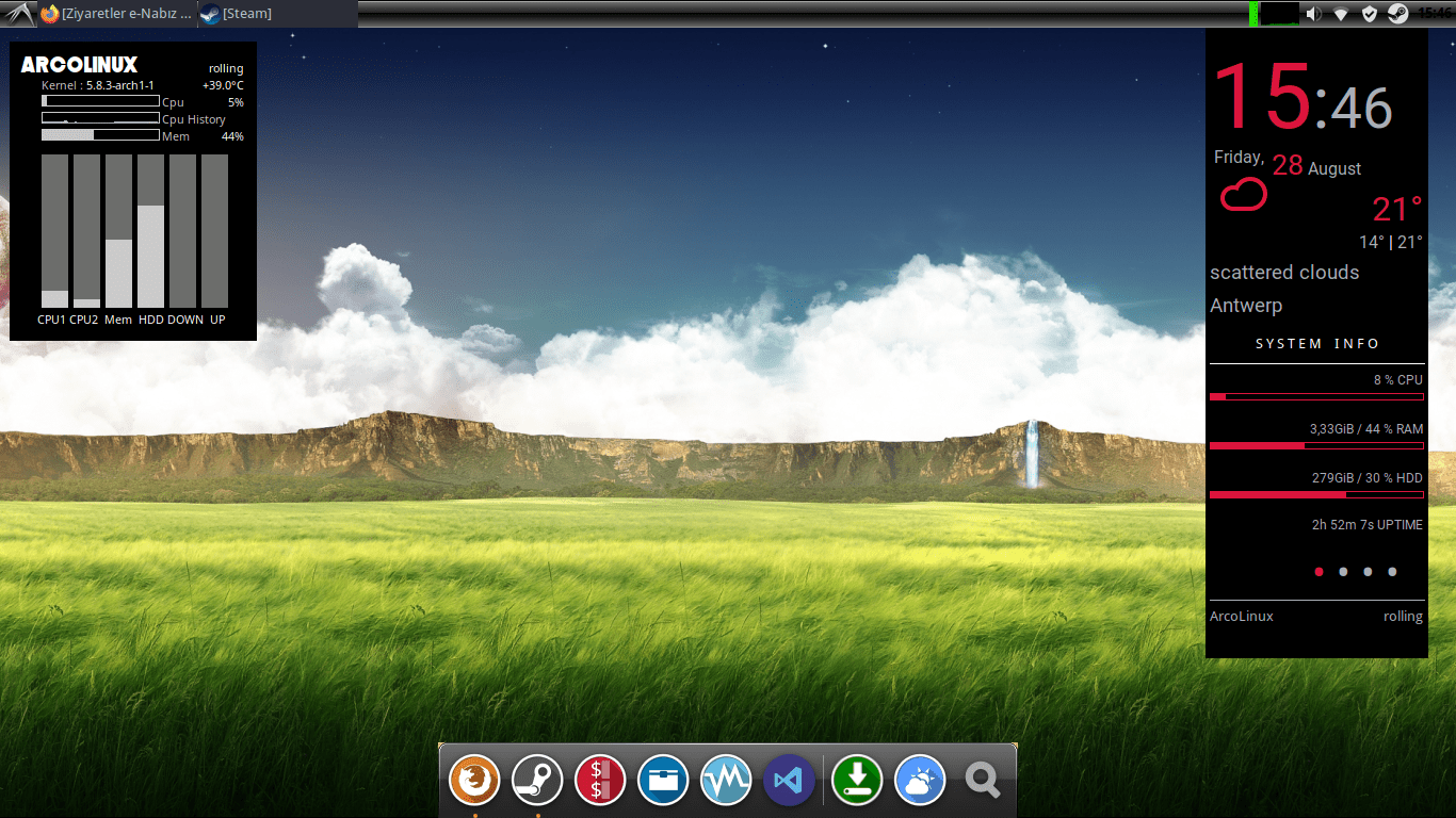 İşte benim masaüstüm. Arco'da istediğin masaüstüne istediğin an geçebiliyorsun. Bu en sevdiğim özelliği.