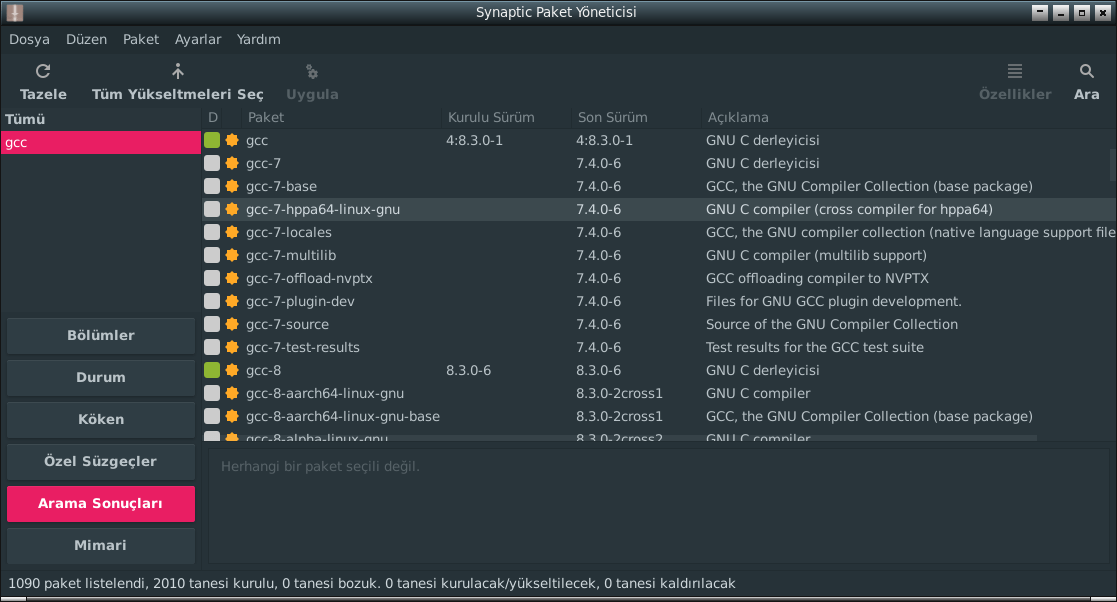 Örneğin bende Synaptic arayüzünde gcc-8 kurulu, sizde gcc-7 kuruluysa onu aynı arayüzden kaldırın ve gcc-8 paketini kurun. Şayet gcc-8 kuruluysa aynı arayüzden sağ tık ile yeniden kurun.