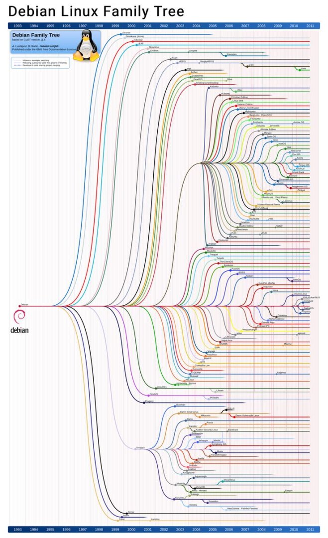 Bu alemdeki tek baba Debian'dır bence hocam. Linux'un kalbidir ve en kadim dağıtımıdır. Ubuntu, Kubuntu, Xubuntu, Wubuntu, Lubuntu, Linux Mint, Zorin, MX Linux, Q4OS, LMDE, Bodhi, antiX vs hepsinin kökü Debian'a dayanıyor. Debian olmasaydı bu kadar birbirinden farklı dağıtım olmazdı. Her ne kadar kullanıcılar sevmiyor olsa da Debian adeta bir rehber niteliğinde dağıtımdır. Şu görsel her şeyi anlatıyor. Hatta diğer ana kol dağıtımlar olan Arch, Fedora, OpenSUSE gibi dağıtımların çıkmasında bile etkisi olduğunu düşünüyorum.