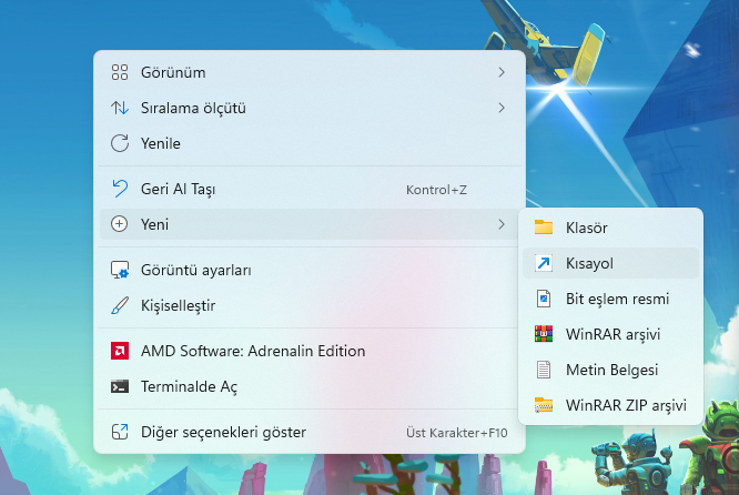 Kısayola yazdığım kod : %windir%\explorer.exe shell:::{A8A91A66-3A7D-4424-8D24-04E180695C7A}
