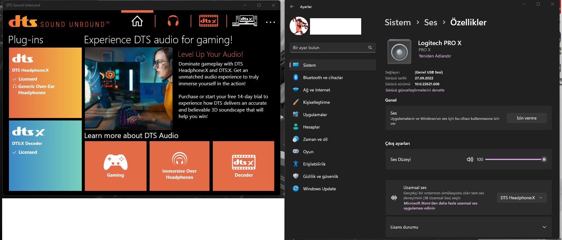 8- Ayarlar/Sistem/Ses kısmından kulaklığı seçiyoruz. Uzamsal ses kısmında "DTS Headphone:X" gözüküyor olmalı. Aynı şekilde sürücü sürümününde internetten indirdiğiniz sürüm olduğunu kontrol edin. (Bilgisayara bağlı birden fazla ses cihazı varsa logitech kulaklığın seçili olduğundan emin olun.)