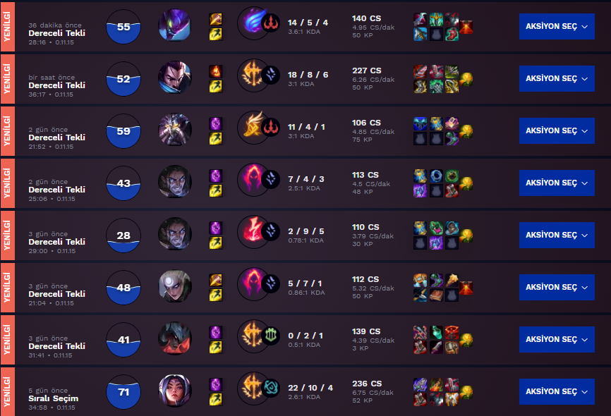 Daha sonra bazı aptallar her ne kadar iyi oynarsam oynayayim, profilime baktığında beni bronz olarak görünce oyun bilgime laf ettikleri için en fazla 5-6 kere oynadığım dereceli maçlarıyla çıktığım lig olan bronzdan yükseleyim dedim. Nasıl olsa iyi oynuyordum. Daha sonra girmez olaydım, hırs yaptım dedim en azından Altın ligine kadar çıkayim ama yok, nasıl adamlar geliyorsa, oyun bilgisi yok, yaptığı hatayı kabul etmez, ölünce ormana laf eder. FF diye ağlar. Afk kalır. İki lafından üçü küfür olur.Dediğim gibi hırs yaptığım için çıkacağım golda diye diye ard arda 8-9 tane dereceli maçı attım ve en kötü lol maçlarından biriydi. O son maçlarımdan birisinde öyle bir sinir olmuştum ki oyuna, gelen takıma. O sinirle LoL'ü bıraktım. Sadece URF geldiğinde eğlence modu için tekrar başlayacaktım, fakat artık daha iyi bir yöntem buldum. Sadece ARAM oynuyorum arkadaşımla. Evet derecelide elo helldeyseniz muhtemelen sonunuz benim gibi olacak.