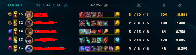 Diğer sezon Silver 3 bitirdim bu sezon oynamadım hiç demir 1 attı. Feed mi dersin AFK mı dersin 1 günde zar zor 96 lp oldum. Üst üste 6 galibiyet aldım sonra feed mi dersin AFK mı dersin 1 17 giden mi dersin, 4 maçtır lose alıyorum. 40 Lp'ye düştüm çıldırmak üzereyim. Ben nasıl çıkacağım bu elo hellden? Sett top oynuyorum taşımak için tek başıma yine olmuyor. Adam Veigar'i 20 2 yapmış tek atıyor, çıldıracağım. Son attığım fotolarda farm bile yapamadım daha fazla ölmesinler diye roam attım hep en başta 3 1'dim Darius karşısında sonra adamı benimle bir yaptılar feedleyip skorlara bakarsanız anlarsınız zaten. Kayn 2 8, cassi 5 13, cait 3 10. lpleri bile en fazla +19 atıyor :D ama kaybedince -25