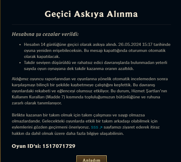 LoL'de haksız yere ban yediğimi düşünüyorum