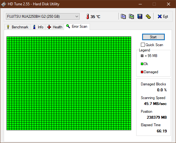 Diski alıp sistemime taktığımda HD Tune uygulaması bir adet hatalı sektör tespit ettim ve sağlık testi kötü sonuç verdi. Görseli de aşağıda yer alıyor. Gördüğünüz üzere 135. kutucukta bir hatalı sektör mevcut. Bu da yaklaşık olarak 12-13 GB arasına denk gelmektedir. Yani bu diskin bu sektörüne veri yazdığım an ya da o sektörden bir veri okuduğum an sorunlar baş gösterecekti. Ben de düşündüm ve aklıma Low Level Format kullanmak geldi.