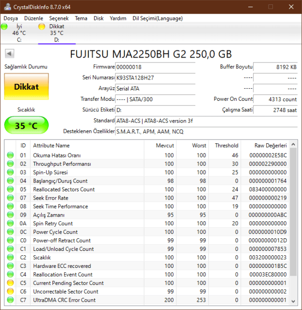 Bütün bu işlemler sonrası diske HD Tune ile tekrar tarama yaptım ve Crystal Disk Info ile tekrar sağlık durumlarına baktım, oluşan sonuçlar beni gerçekten şaşırttı. Yani benim gibi disk kurtarıp belki içine birkaç şey yüklerim hiç yoksa bir Linux dağıtımı kurup dual boot devam ederim diyorsanız denemekten zarar gelmez. Test sonuçları da aşağıda mevcut.