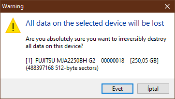 7) Bu tuşa tıklayınca karşımıza bu aygıtı gerçekten biçimlendirmek isteyip istemediğimizi soran ve tüm verilerin silineceğini belirten bir pencere karşımıza gelecek. Ve biz de "Evet" deyip işlemi başlatacağız.