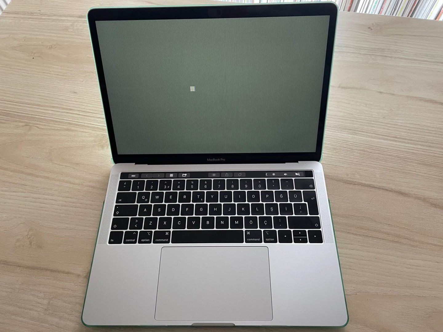 Bilgisayarımı uykudan uyandırdıktan sonra ekran bu hale geldi, sistem işler durumdaydı parmak izi vs. soruyordu touchbarda gördüğüm kadarıyla gördüğünüz beyaz kare cursor idi. Yeniden başlatma sonrasında düzeldi. Safari'de YouTube'da video izlerken tam ekrana aldığım zaman ekranda flicker dediğimiz olay oluyordu.