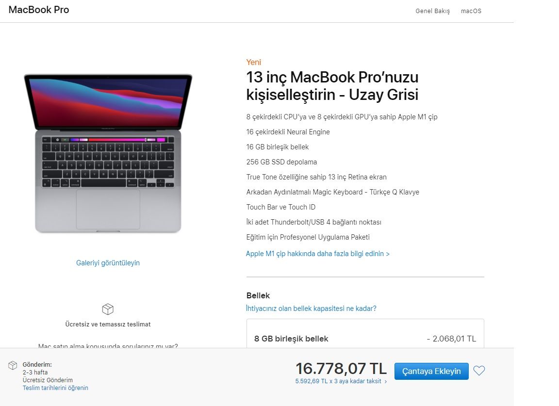 3- MacBook Pro 13 = M1 çip + 16 GB RAM + 256 GB SSD -(AirPods yok)