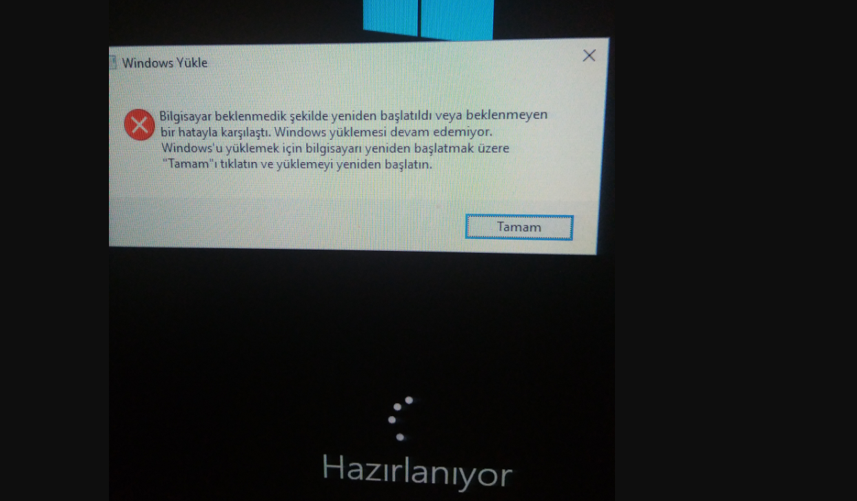 Merhaba, MacBook Pro 2014 modelinde mevcut olan 128 GB SSD'yi 500 GB kapasiteye sahip Samsung 970 EVO MZ-V7E500BW 500 GB NVMe M.2 SSD ile değiştirdik. Diskin uyumlu olması için SSD çevirici adaptör kullandık. Sistem diski problem olmadan gördü ve Catalina versiyonunu yükledik. Kurulumu yaptıktan sonra güncelleme ile Big Sur versiyonuna yükselttik. Windows kurulumu da yapmak istiyorduk bunun için Windows 10 ISO dosyasını indirerek Boot Camp aracı ile ISO dosyasını USB belleğe yazıp kurulum adımına geçtik programın yönlendirdiği şekilde. Windows 10 kurulum ekranında işlemleri başarıyla gerçekleştirdik, diski seçimini vs. yapıp kurulumu sonlandırdık. Kurulum tamamlanıp sistem tekrar başlatıldığında Cihazlar Hazır Duruma Getiriliyor aşaması geçtikten sonra Windows Yükle hata penceresi ile karşılaşıyoruz. Tamam butonuna tıkladıktan sonra sistem tekrar yeniden başlayıp aynı hata penceresi tekrar çıkıyor karşımıza. İlgili hata ekranı aşağıdaki bağlantı adresinde yer almaktadır.