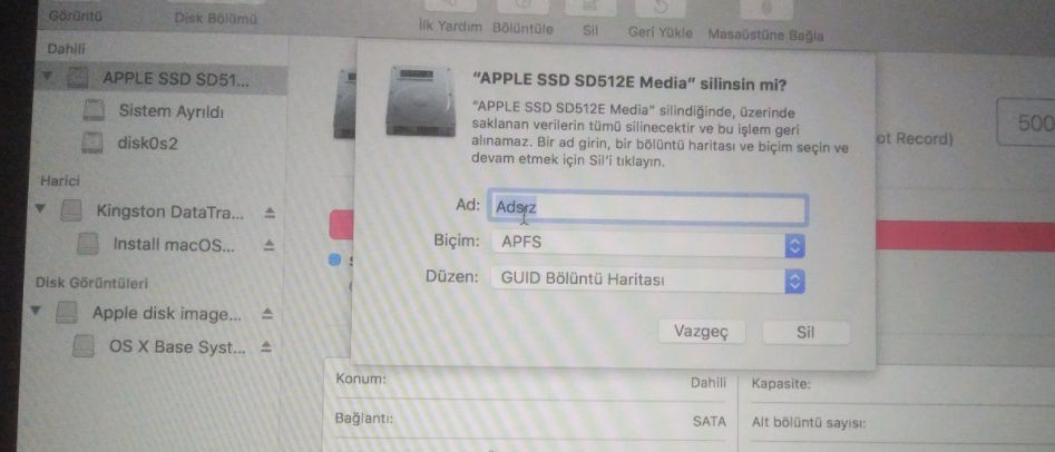 Öyleyse burada Adsız yerine disk adı yazıp (istediğin bir isim örneğin macOS), sil deyip devam edin.