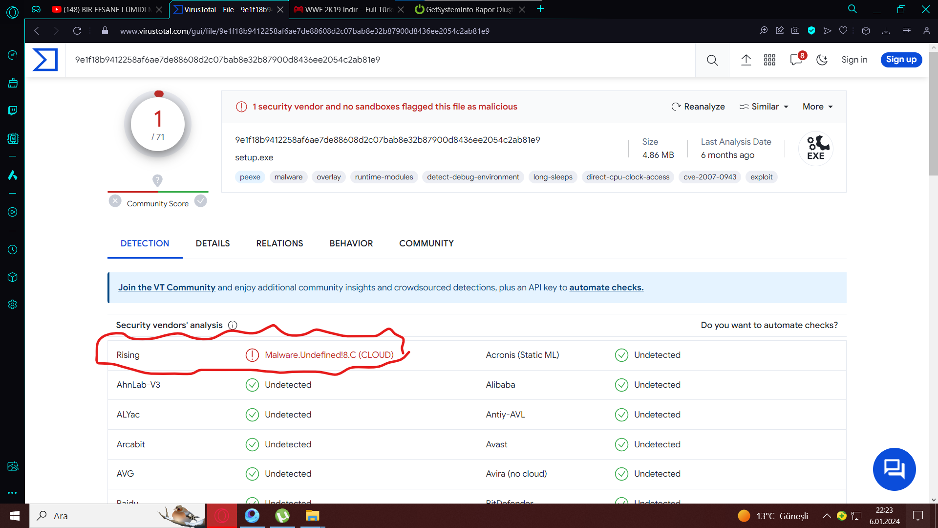 WWE 2K19 indirdim, virüslü mü diye baktım. VirusTotal bir sonuç buldu. Bu tehlikeli mi?