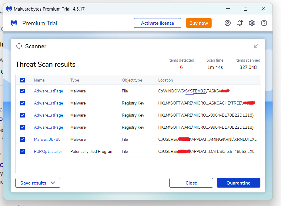 Virusler Windows dosyasına sızmış ve kayit defteri şu an Malwarebytes uğraşmak istemiyorsanız format atin sıfırdan temiz formattan sonra antivirüs yükleyin virüs sokuyorsunuz Malwarebytes de size virüsleri gösterip temizletiyor.