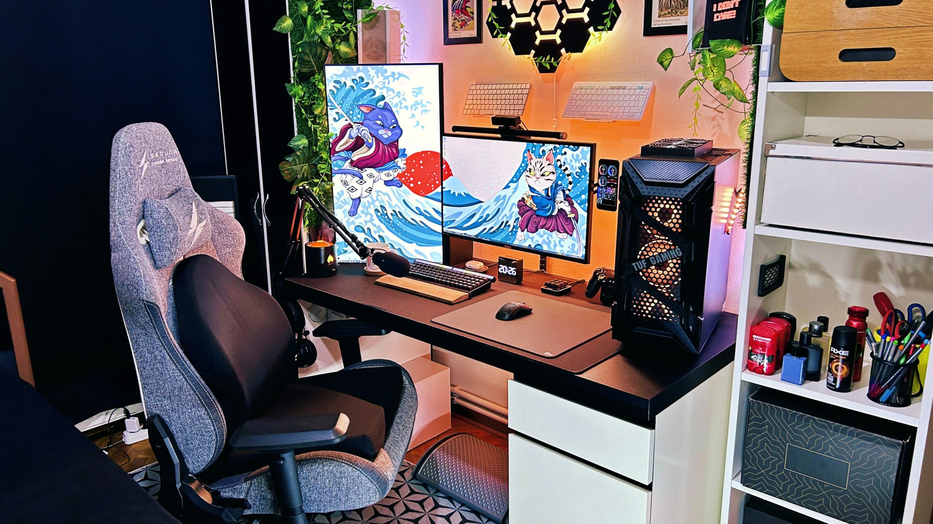 Wallpaper Engine kullanıyorum. Monitör layout ve ölçülerine göre Photoshop'ta ayarlama yaparak bu şekilde devamlılık sağladım iki ekranda da.