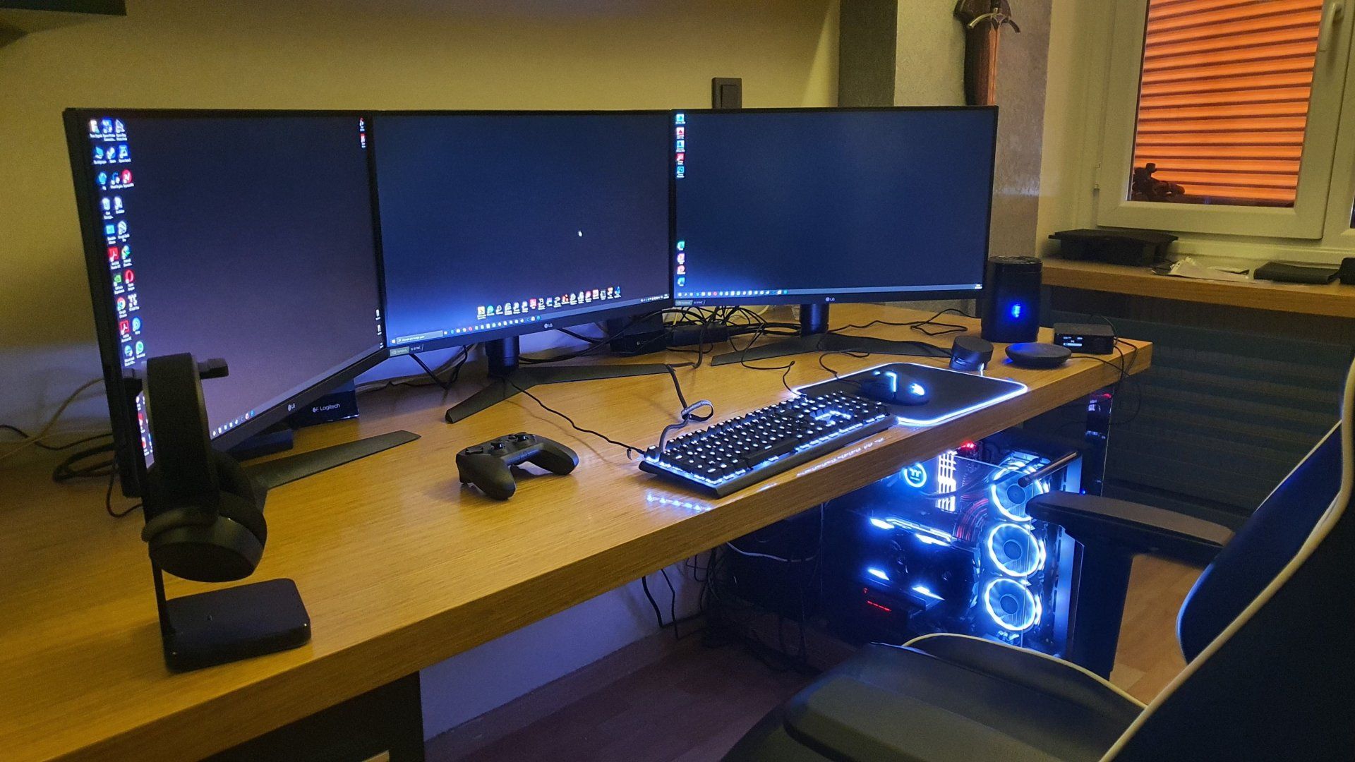 Bu da eski Corsair set zamanında çektiğim: Monitörleri değiştirip 1 tane daha ekleyince en soldakinin DP kablosu kısa kaldığı için bir süre kasayı yukarı almıştım. Sonra DP kablosunu uzatınca aşağı taşıdım tekrar.
