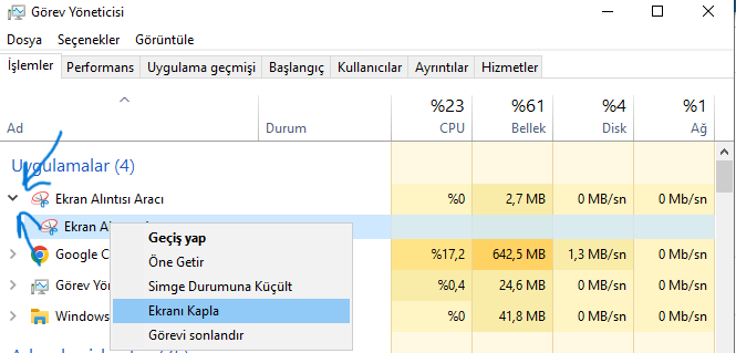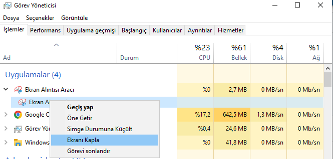 Anladım, Görev Yöneticisini açıp bu sorunun oluştuğu bir programa sağ tıklayıp Ekranı Kapla yapar mısınız?