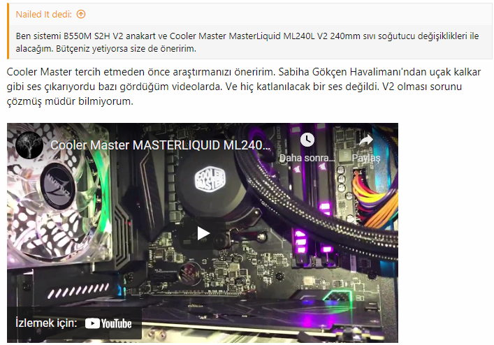 Bu konuda söylenmiş, ML240L kullanıcısı değilmiş yanlış hatırlamışım, videolardan görmüş fakat genel olarak Cooler Master sıvı soğutuculardan şikayetçi bir arkadaş.