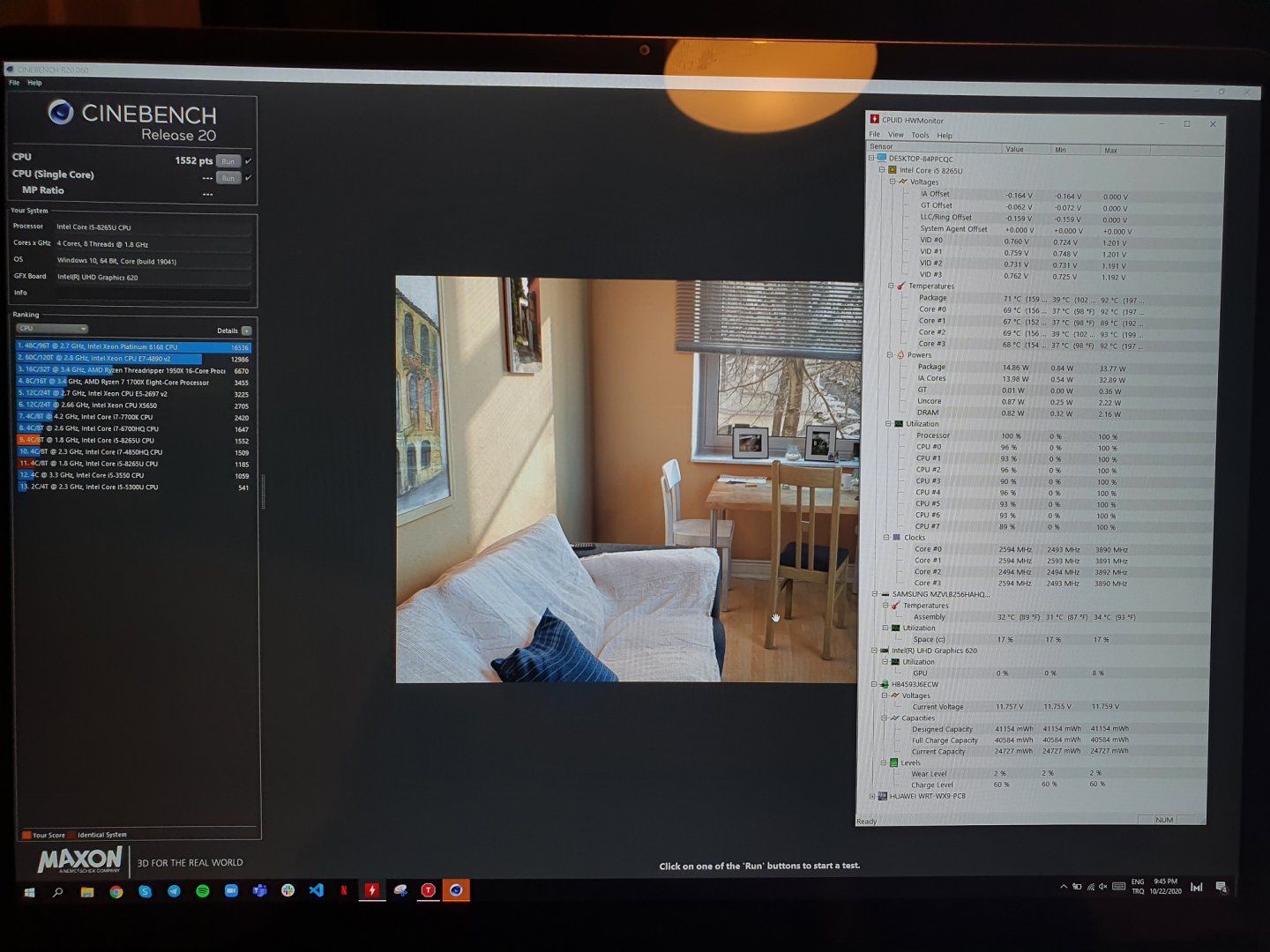 -130 mv çekirdek/cache voltajı, -113 mv GPU voltajı ve 3.4 GHz Turbo kilidiyle, pilde, dengeli modda, işlem önceliği normalken aldığım değer: