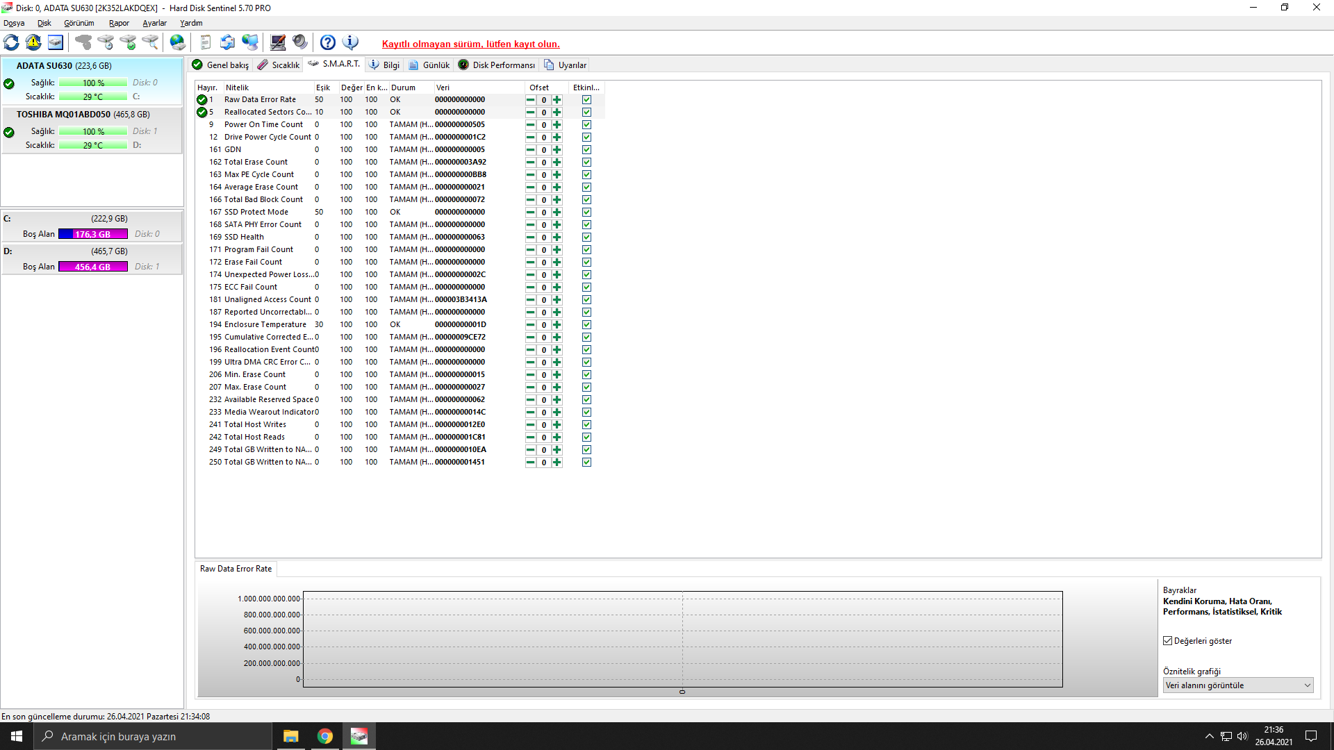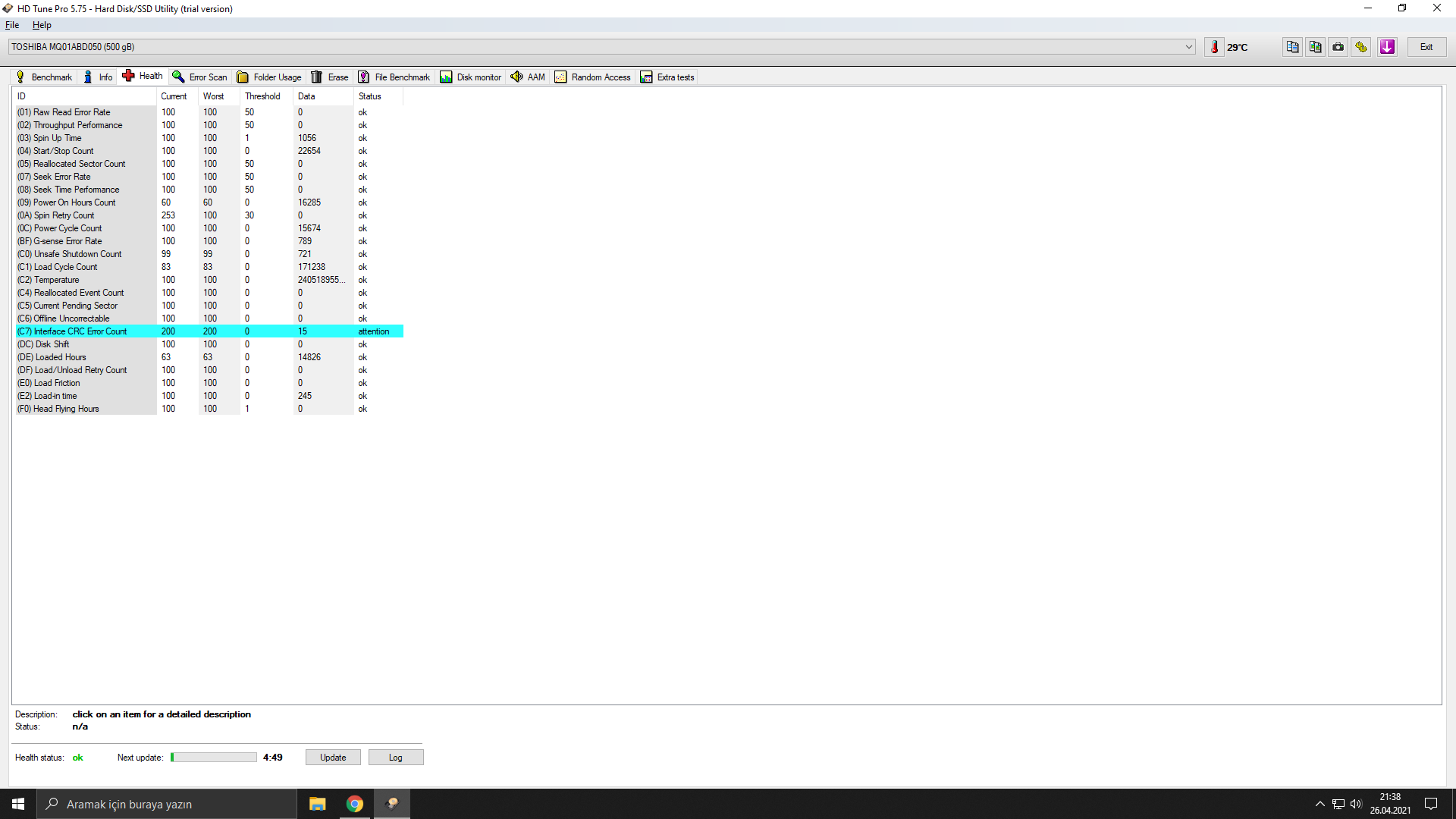 HD Tune yazılımı ile diskine "error scan" testi yap ve "health" sekmesini paylaş.