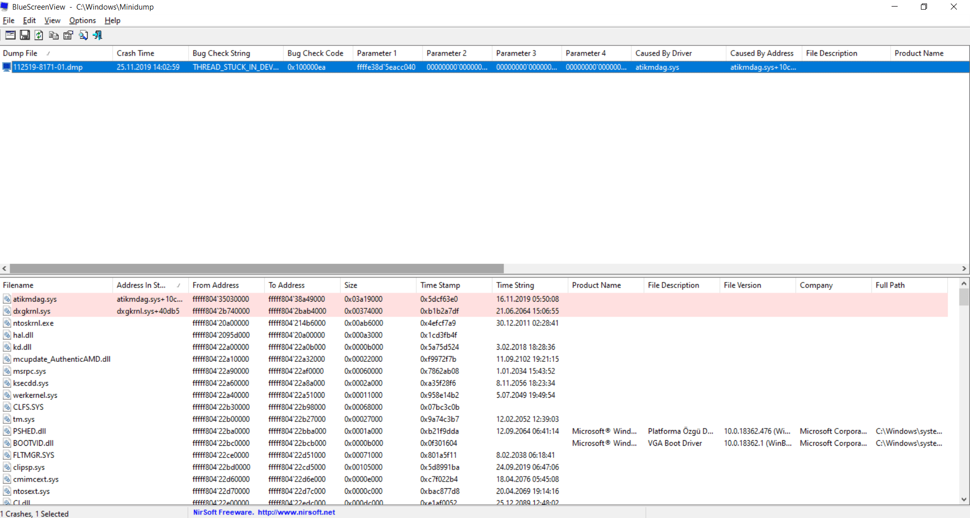 Kullandığınız ekran kartı AMD'nin kartı ve %90 ihtimal ile chipsetinizde sorun var. Dump dosyası incelendikten sonra detaylı bilgi verilir ancak verdiği kod ve sizin attığınız görselden ve tabi geçmiş tecrübelerden yola çıkarak ekran kartınızın chipset'i arızalı olduğu için veriyor onu. Akşam üstü eve geçince dump dosyasını inceleyip net bir sonuç paylaşırım sizinle.Yaklaşık 1 ay önce laptop satın aldım. Herhangi bir sorun yoktu, ancak 2 gün içerisinde 3-4 kez mavi ekran hatası aldım. BlueScreenView programı ile tarattım ancak bir şey anlamadım. Sorunun kaynağı nedir arkadaşlar?