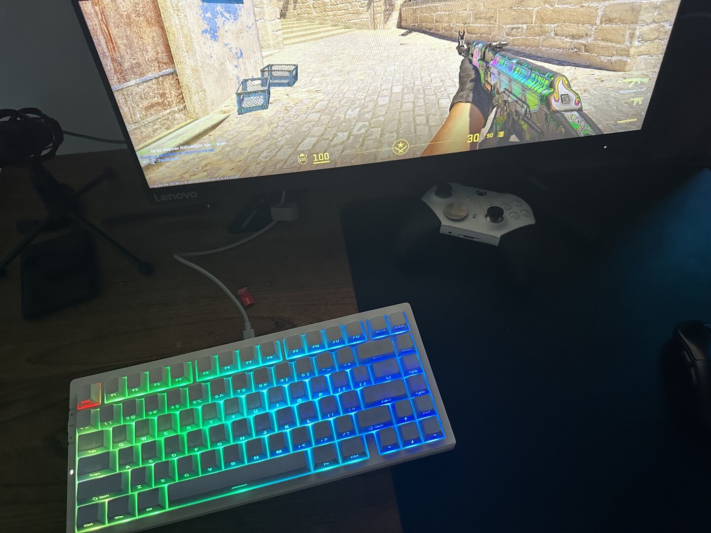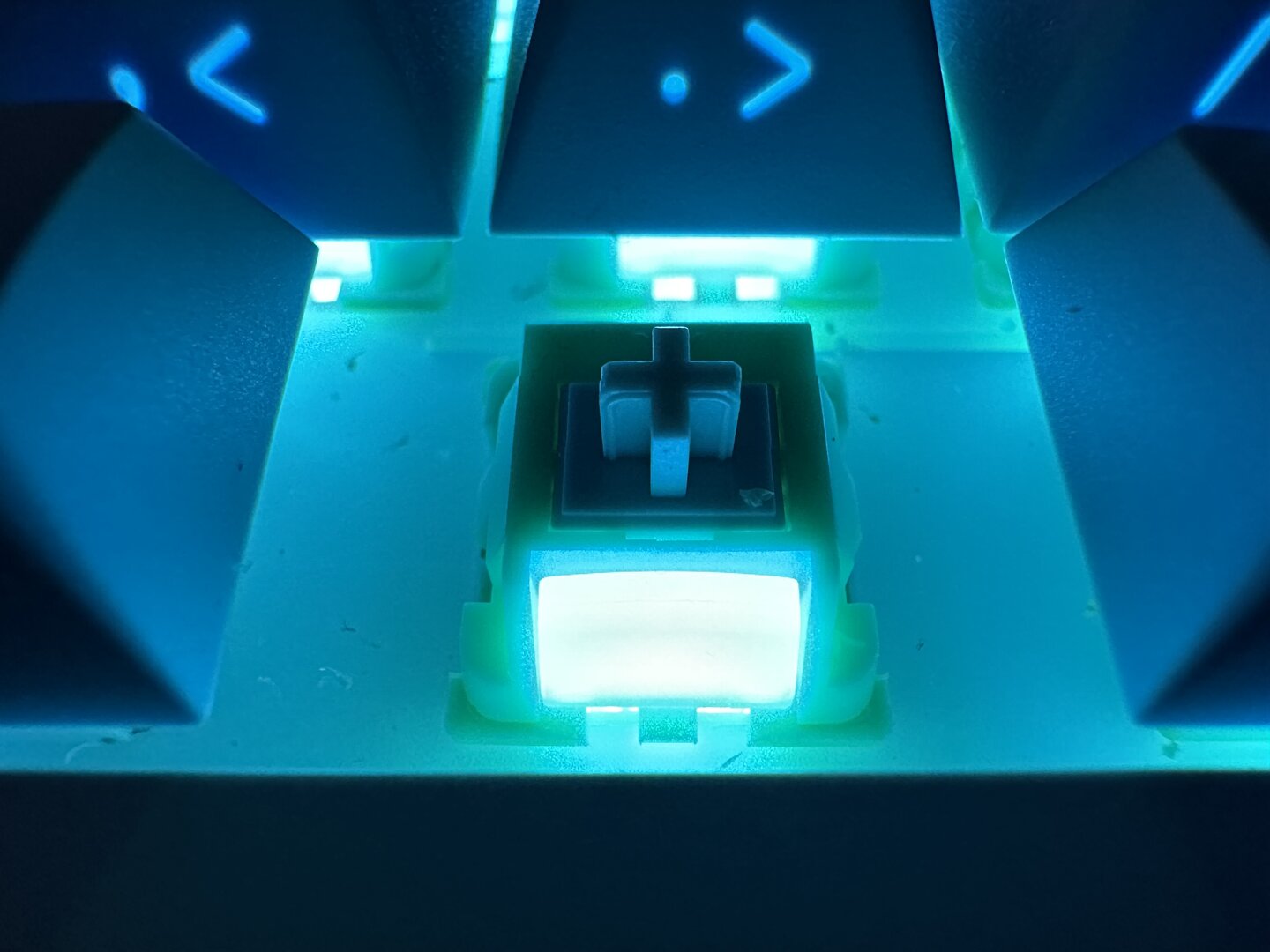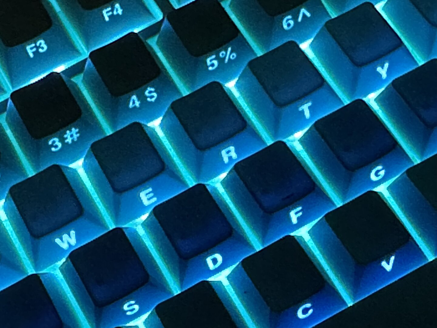 3- Işık karanlıkta açıkken keycaps'lerin içindeki plastikler değişik gözüküyor. Ayrıca yazıların enzimli baskısı ışığı gölgeli gösteriyor.
