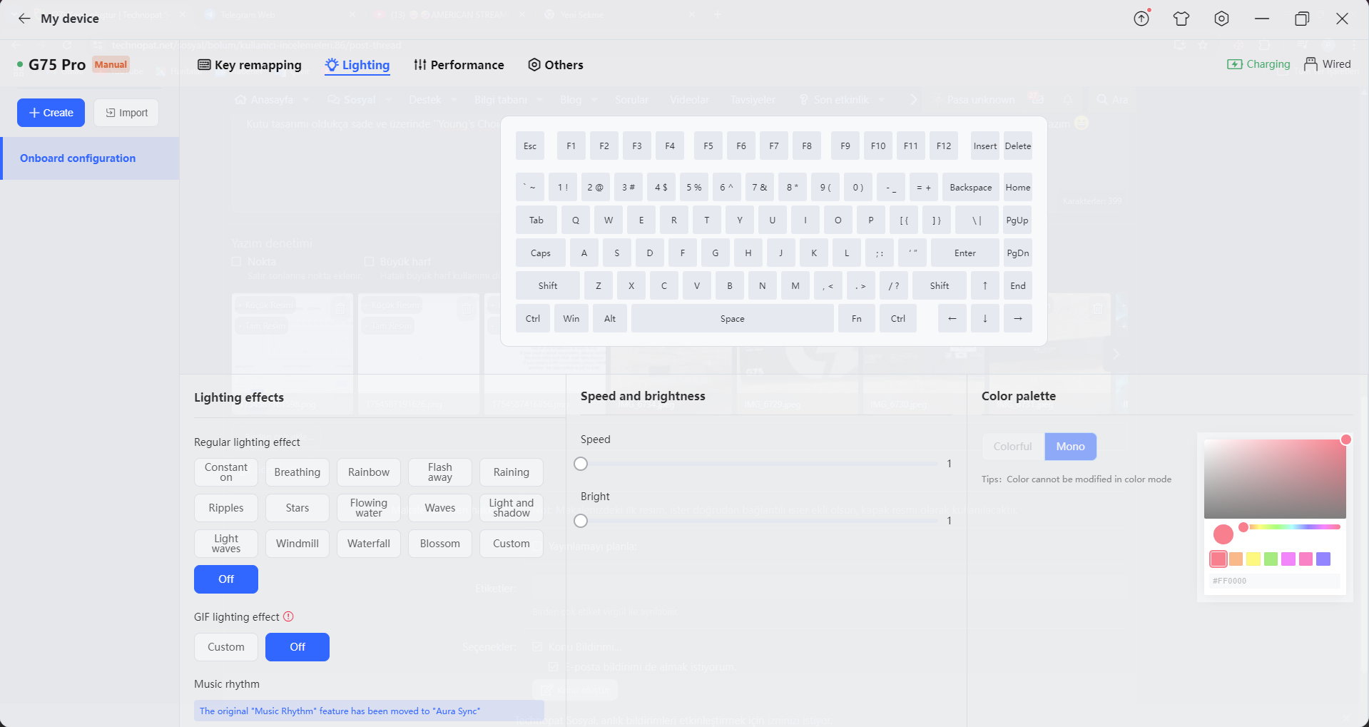 2- 2.4GHz moduna geçersem herhangi bir şekilde modları değiştiremiyorum. Işık kapalıyken Rainbow moduna geçiyor bir anda ve bu uygulamada ışığın kapalı olduğunu göstermesine rağmen oluyor. Bundan sonra ise 2.4GHz modundan kablolu moda geri geçince uygulama ''Disconnected'' diyor ve herhangi bir şekilde klavyeyi algılamıyor.