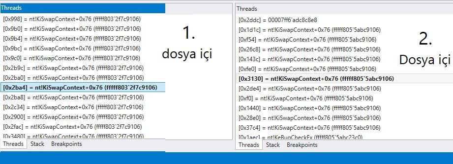 * .DMP dosyalarının ilki 1.5 GB, ikincisi 1 GB, kimse indirmek istemeyeceği için muhtemelen kendim açıp paylaştım. Dosyaları WinDbg Preview ile açıp, analiz ettim. Kimse DMP dosyası nasıl paylaşılır diye boşuna link atmasın lütfen. Yine de indirmek istiyen var ise, yükleyebilirim.