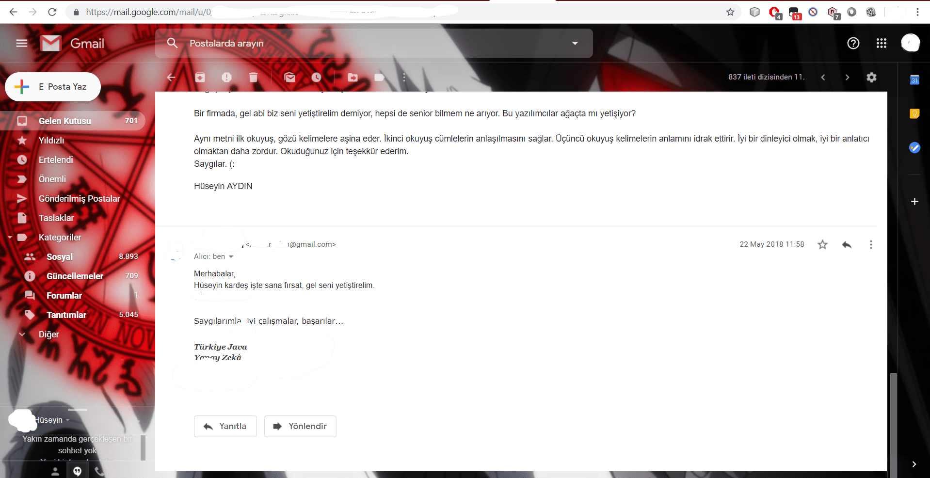 Al kardeş bu mail de CV'mi göndermiş idim. Cevap yazan adam Türkiye de tanınmış önemli bir bilgisayar yüksek mühendisi. Adam diyor ki yetiştirilmen lazım. Gel seni yetiştirelim. Sen yeterlisin demiyor. Yani okullar yeterli yetiştirmiyor. Umarım anlatabilmişimdir. Ağzımı Zipledim.🤐