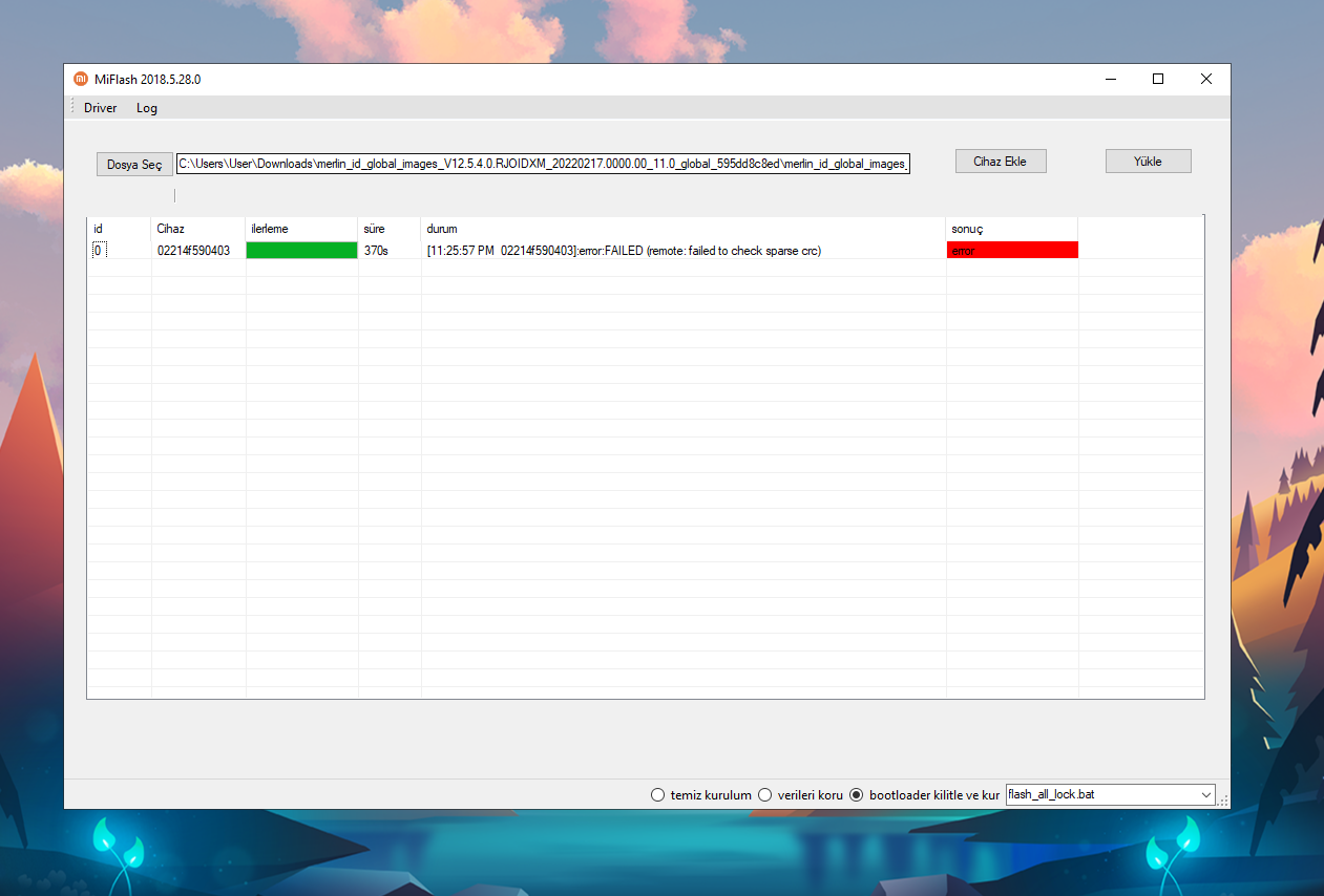 Mi Flash failed to check sparse CRC hatası