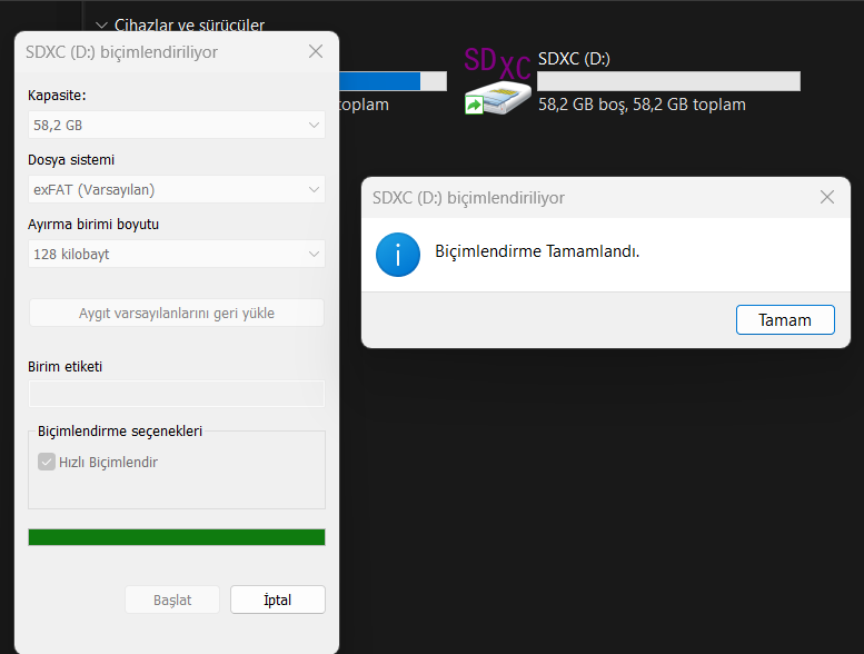 Araç kamerası için Micro SD kart aldım. Aldığım ilk SD kart bozuk çıktı daha sonra farklı bir markanın aldığım SD kartı biçimlendirip kullanmak istedim. Biçimlendirme yaptım fotoğraftaki gibi ama kartın simgesi değişmiyor. Normal şartlarda değişmesi gerekiyor. Kameraya takıyorum format uyarısı veriyor. exFAT ve FAT32 versiyonu denedim ama hiçbir şekilde kartı formatlayamadım. Ne yapabilirim?