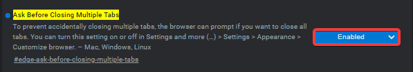 edge://flags/#edge-ask-before-closing-multiple-tabs adresini tarayıcınızın adres çubuğuna yapıştırın ve sarı olarak belirtilecek olan (yukarıda da belirtilen) seçeneği Enabled olarak seçiniz.