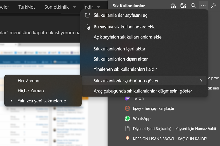 Merhaba. Microsoft Edge'de "diğer sık kullanılanlar" menüsünü kapatmak istiyorum nasıl yapabilirim?
