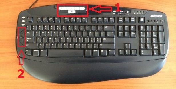 Merhaba, elimde Microsoft 1031 digital Media keyboard 1.0a model eski bir klavyem var ve kısayol tuşlarının bazılarını çalıştırmanın yolunu bulamadım. Klavyemde sorun olduğunu düşünmüyorum. Microsoft mouse and keyboard Center programını indirdim fakat desteklenen aygıt bulunamadı gibi bir yazı çıkıyor. 3.parti uygulamalarla da denedim fakat o programlar bu kısayolları görmüyor. Görselde belirttiğim tuşlar çalışmıyor. 2 numaralı işaretteki buton aşağı yukarı hareket edebiliyor ve üzerinde "+,-" işaretleri var. Bu kısayolları nasıl çalıştırabilirim? Teşekkürler.