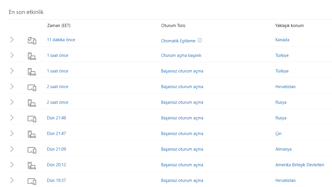 Durmadan her gün giriş yapılmaya çalışıldığını görüyorum birçok ülkeden. Hepsi başarısız. Virüs taraması temiz. Telefonla doğrulamam hep açık. Aşırı rahatsız edici. Bu Microsoft ülke dışı bağlantıları engelle seçeneğini getirse bizde hiç uğraşmasak keşke. Bunları engellemenin bir yolu yok sanırım. Otomatik eşleştirme mi yapmaya çalışıyorlar? Bu nedir?