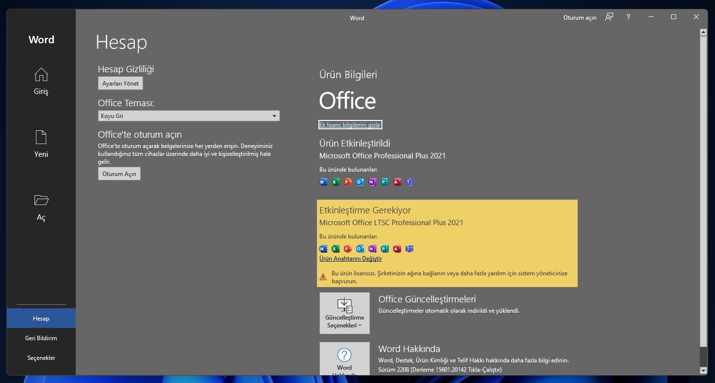 Sonra Word'u kapatıp yeniden açtım ve sol alttaki 'Hesap' kısmına baktığımda;