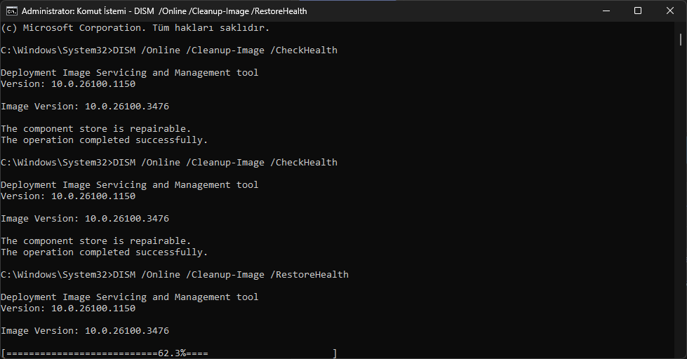Şu an RestoreHealth'dayım. Bir süredir %62.3'te dondu kaldı. Ayrıyeten üsttekileri çalıştırdığım gibi bittiler.