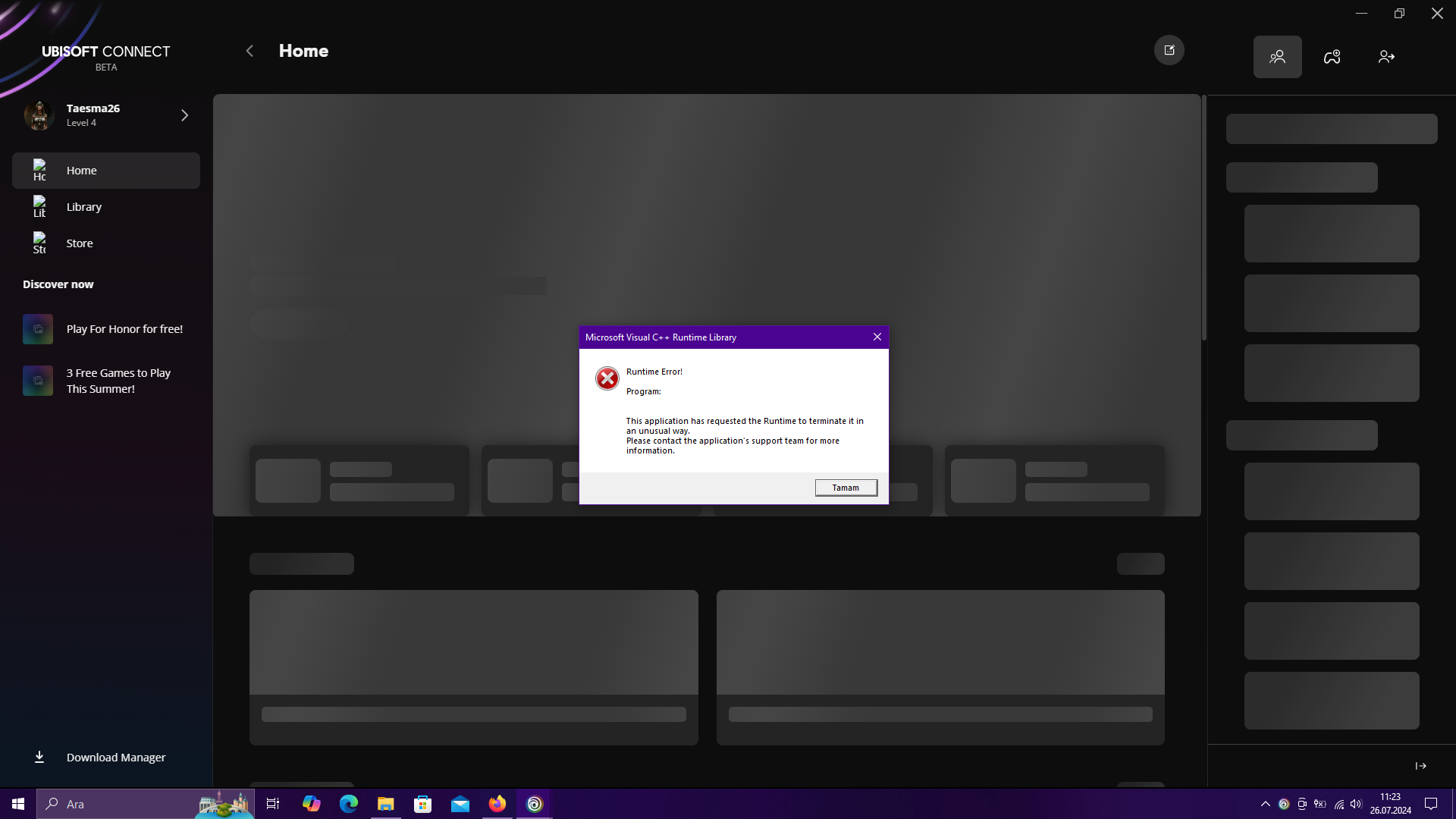 Dün Assassin's Creed 1 oynarken aldım. Sorunun oyundan kaynaklı olduğunu düşündüm ama ne yazık ki Ubisfot'dan kaynaklıymış. Uygulama bende 16.03.2024'ten beri yüklüydü. Origins, South Park ve Rainbow 6 Siege oynarken sorun çıkartmadı hiç. 3-4 gündür AC 1 oynuyordum ve dün bu hata çıktı. Microsoft Visual C++ hepsini sildim yükledim ama sorun hala devam ediyor.