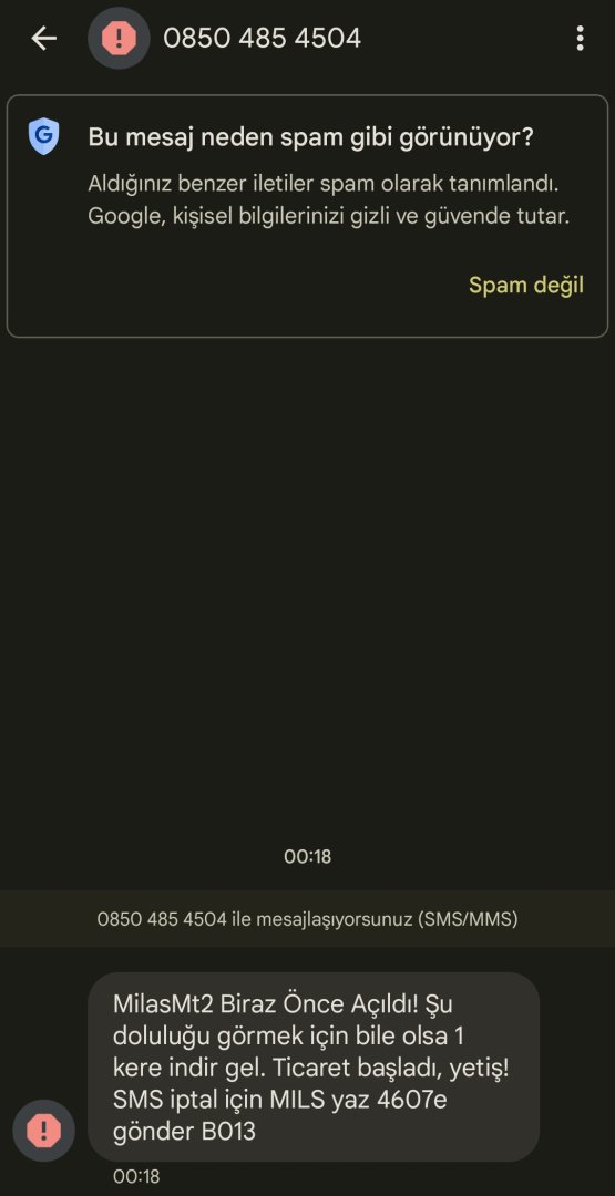 Milasmt2'den devamlı gece ve gündüz mesajlar geliyor. Telefon rahatsız etmeden spam mesajlara atıp engelliyor. Milasmt2'den gelen mesaj iptali için "MILS yazıp 4607"e mesaj gönderiyorum mesajlar iptal olmamış yine bana mesaj geliyor. Sizde de durumlar aynı mı son zamanda herkese gelmeye başlamış bu mesaj.