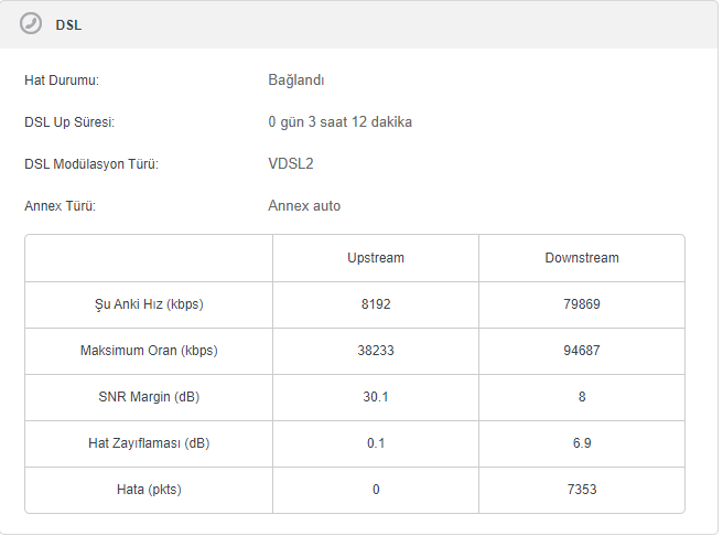 Hat zayıflaman iyi. SNR değerin kabul edilebilir seviyede fakat 3 saat için 8000 tane hata almışın bu iyi değil. Hattında sıkıntı olma ihtimali var. Ve ya saha dolabına çok fazla yüklenme oluyor. Hızını 60-70 arasına düşürsünler bir de öyle dene sorun olmazsa öyle kalsın. Sorun hala devam ederse Millenicom kaynaklı olabilir.