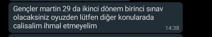 Bu dönem de sınavın hiç bir bahanesi olmaz, olamaz. Ne verdin, öğrettin de? Ne istiyorsun ? Erişemeyen, EBA gibi sürekli çöken bir yerden sözde eğitim gördük. Ne güzel eğitim ama. Hiç bir şey bilmiyorum. Kitap olmasa şuan bildiğim 1,2,3 parça bir şeyi bile bilemeyeceğim. Ve daha hiç bir şey olmamış gibi. Son gaz açıklama yapmaması, görmemezlikten gelmesi. Daha da kötüsü sınıfta kalma olması. Yani ciddi, ciddi. Sanki hiç salgın yok, herkes tüm dönem okul da yüz yüze eğitim gördü. Gibi sınav yapmaya taktı.